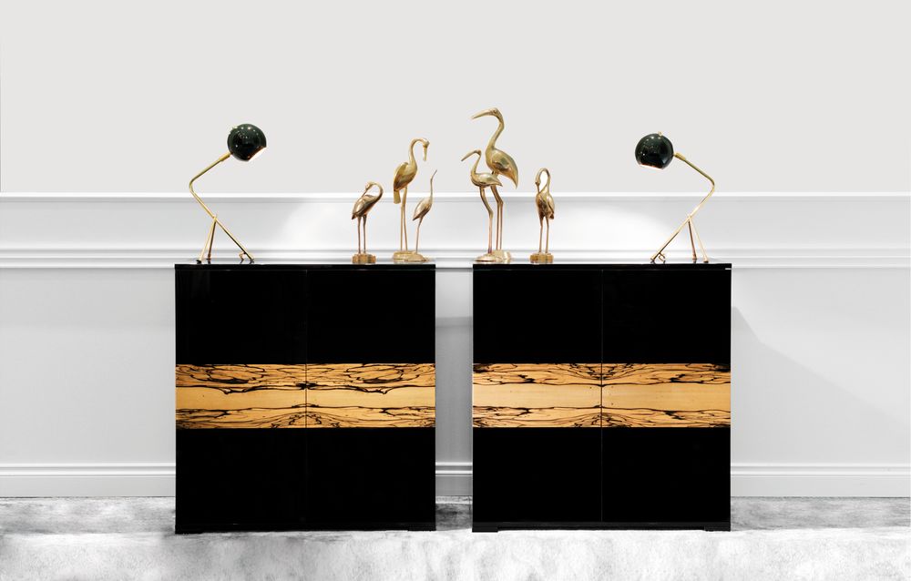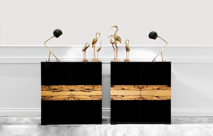 Functional and timeless, Philippe Alto gives a precious, refined and modern touch to a living room, a dining room or a large entrance. Equipped with two doors that open in two interior compartments separated by a shelf each, the cabinet stands out for the front doors, where the black finish is enlivened by a horizontal central insert in albin wood. The interiors are gloss black lacquered.