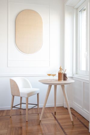 Its tall, slightly curved backrest and soft seat provide comfort and support, while its slim legs in raffia and metal footrest add a touch of refinement.