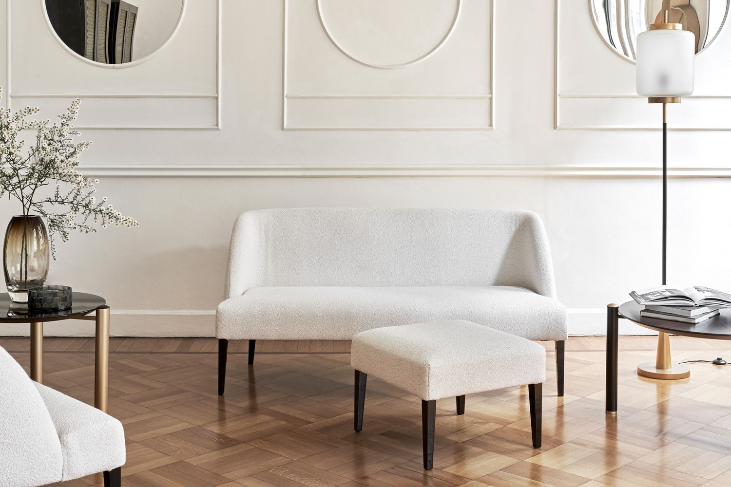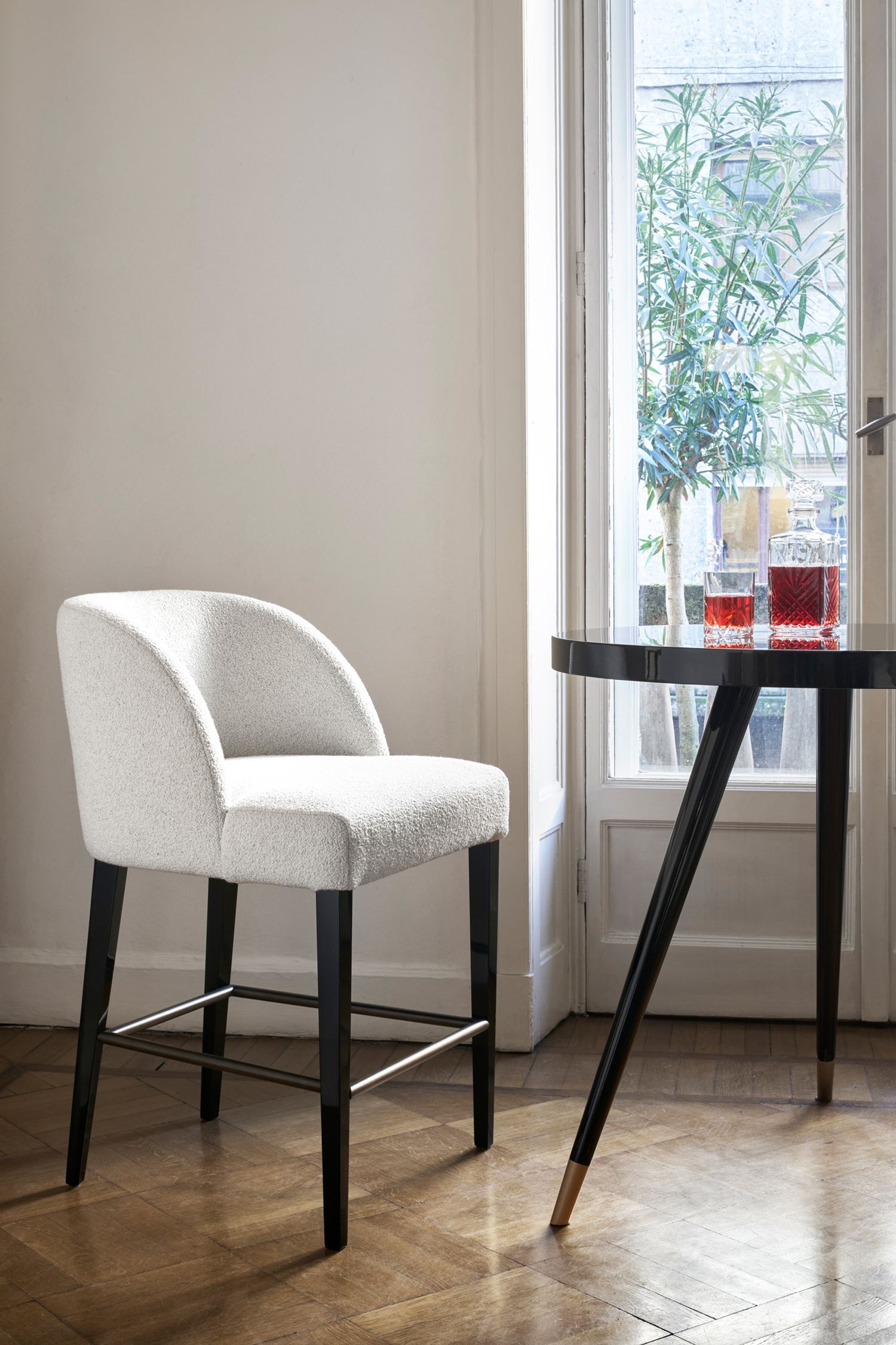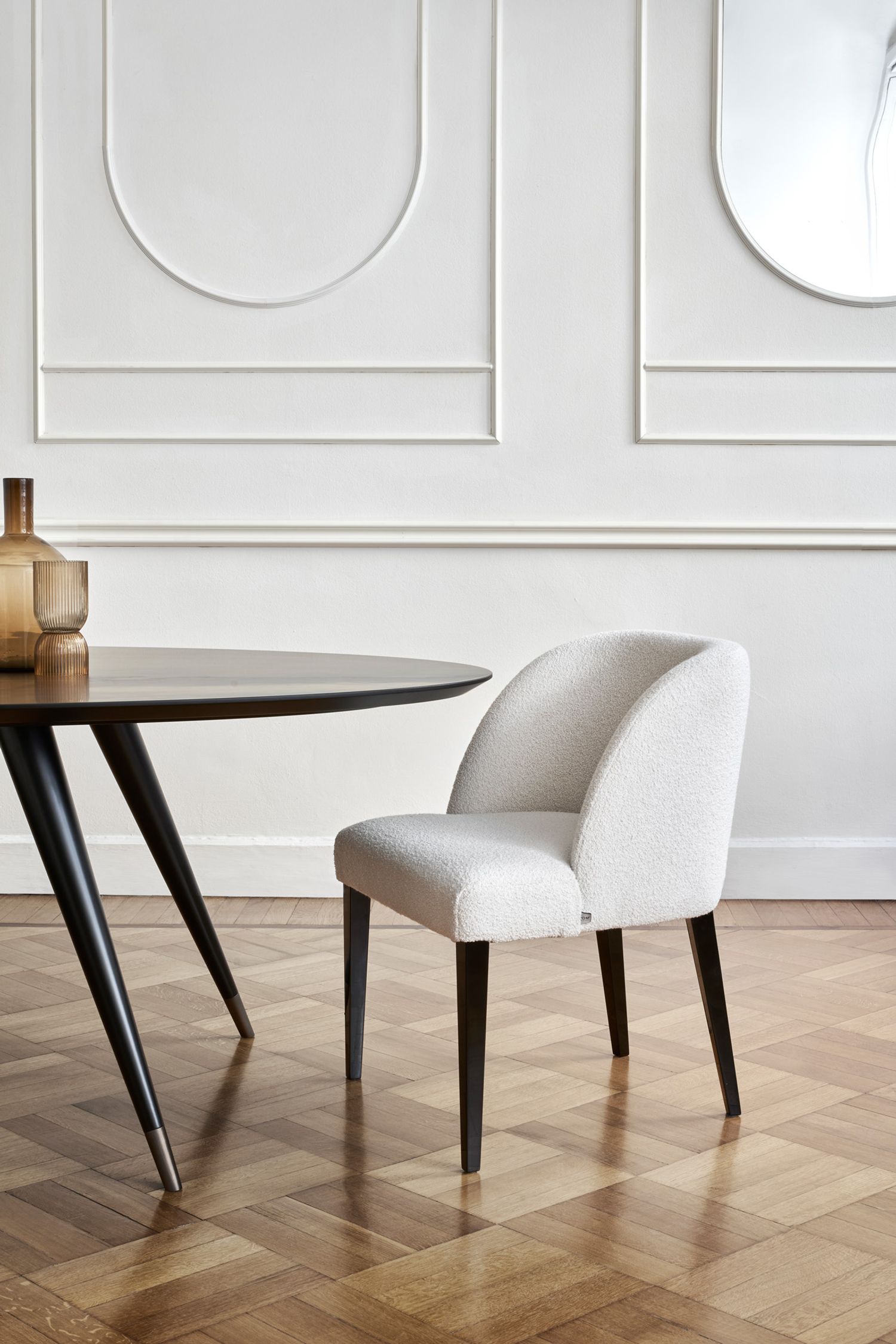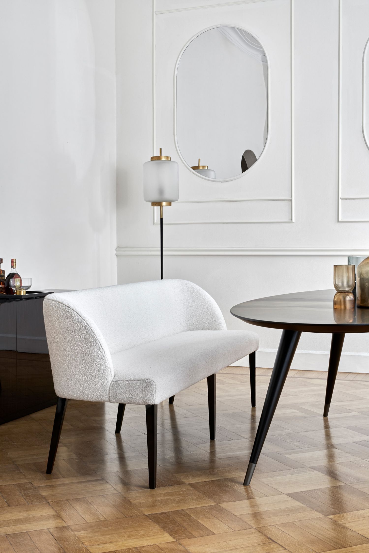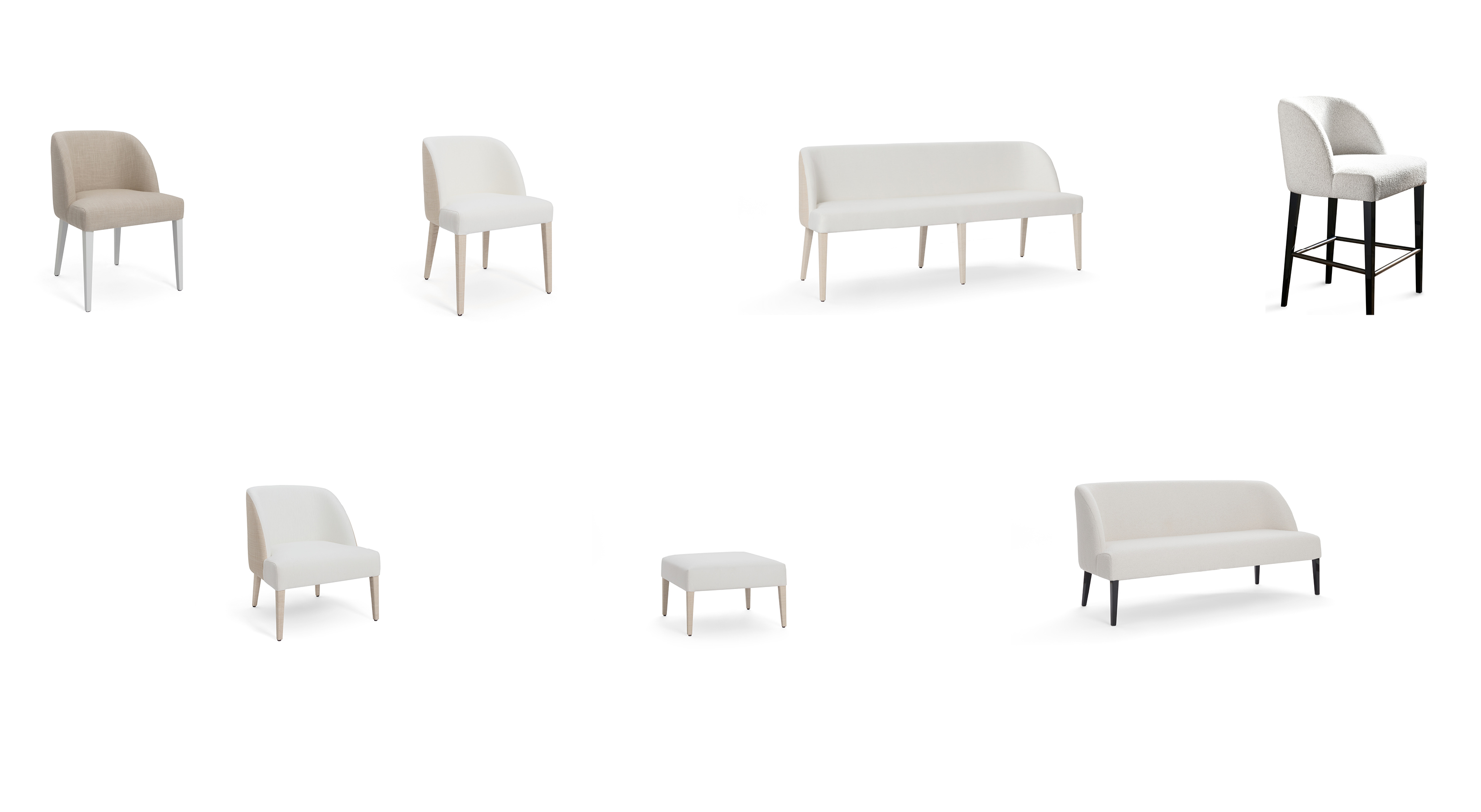 La famiglia di sedute Colette include: la sedia da pranzo e la panca da pranzo; lo sgabello, il divanetto, la poltroncina e il pouf.
