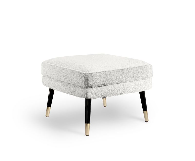La famiglia di sedute Bernadette include la sedia da pranzo e la panca da pranzo, lo sgabello, il divanetto, la poltroncina e il pouf.