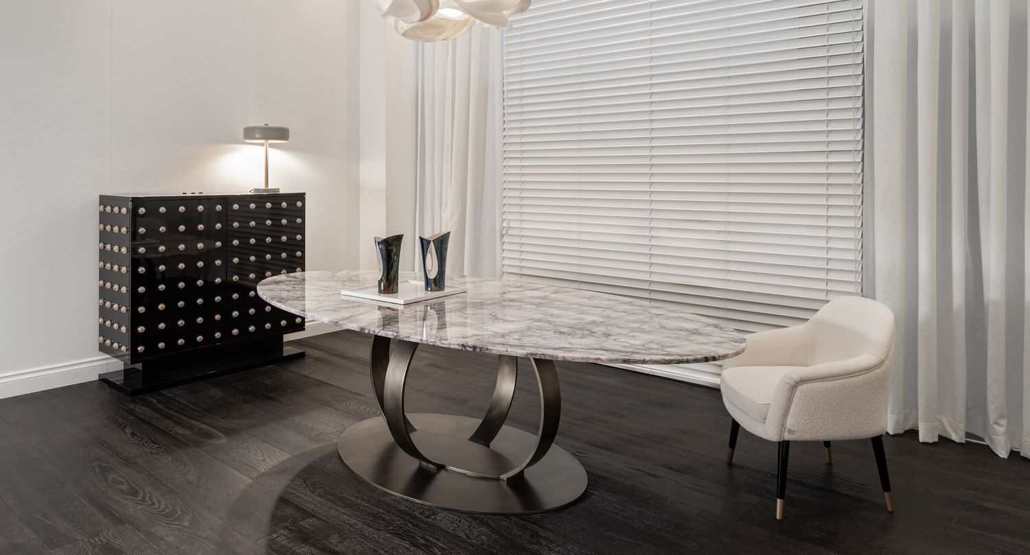 La prima, dedicata alla collezione iconica di DOM Edizioni, una collezione contemporanea, caratterizzata da forme eleganti e materiali di pregio, legni scuri, marmi e raffinati dettagli in metallo.