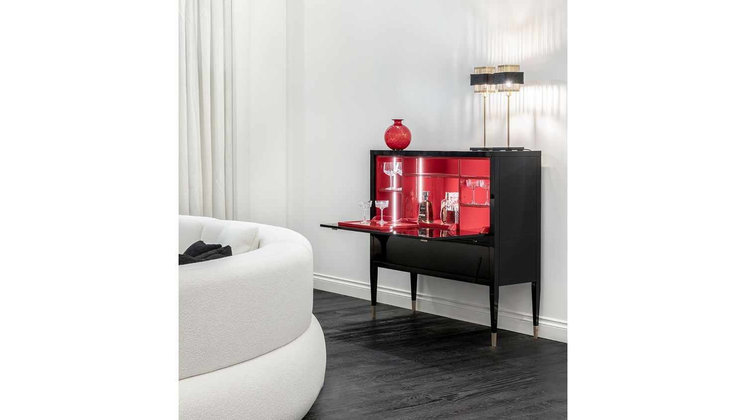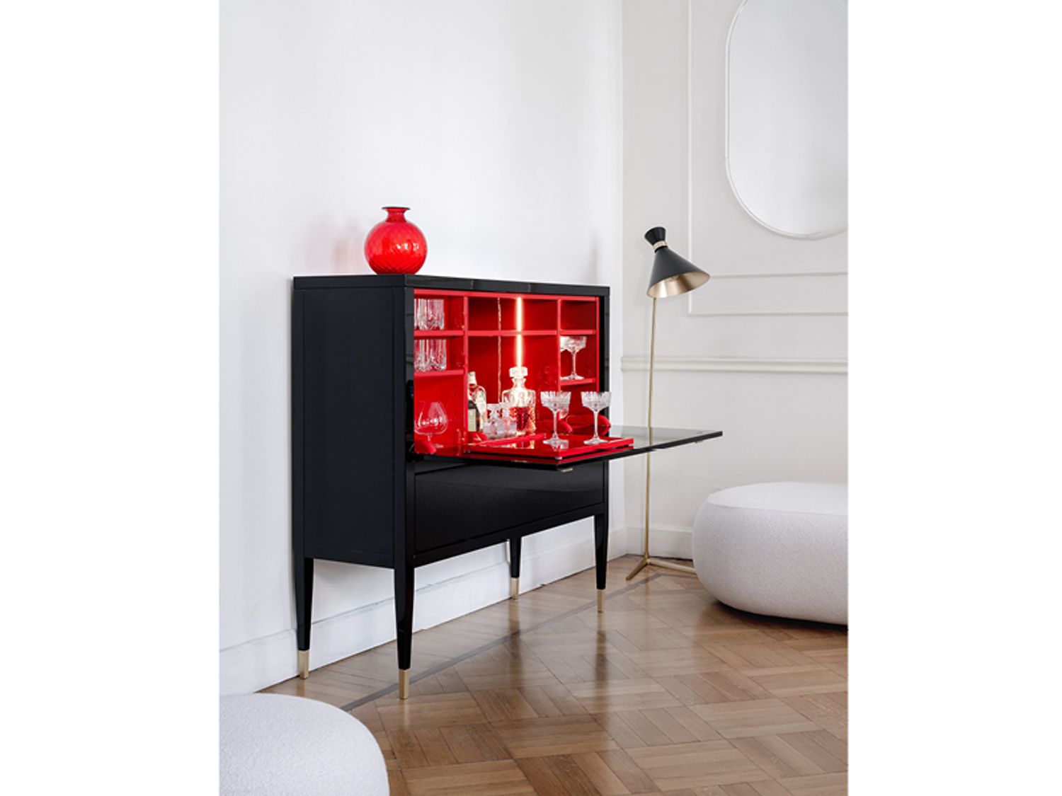 Tanguy, mobile contenitore già presente a collezione, cambia veste e diventa un mobile bar. Discreto quando chiuso, si svela da aperto con i suoi interni laccati color rosso.