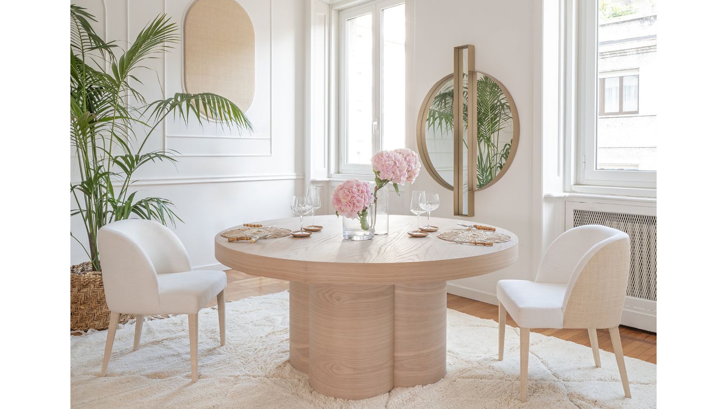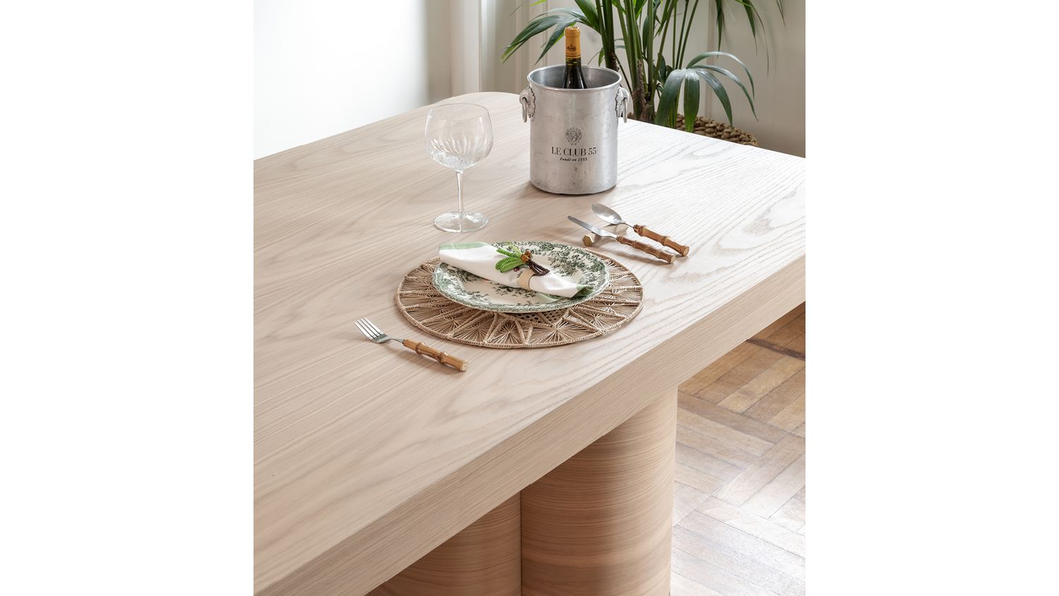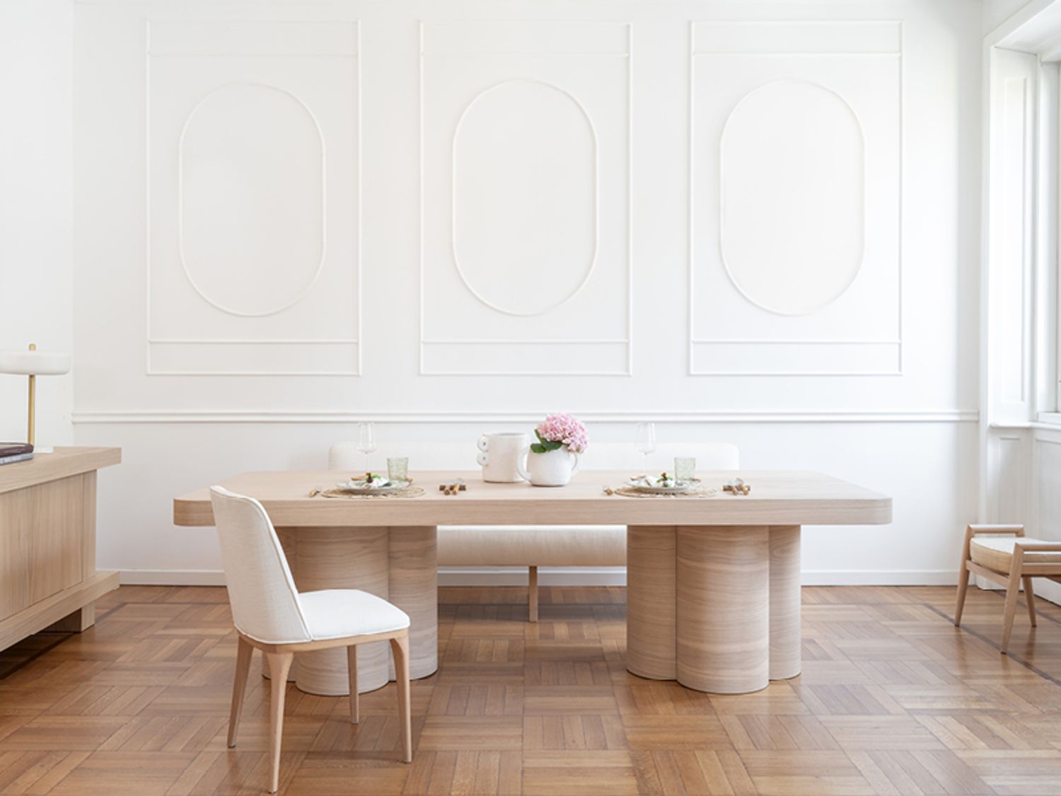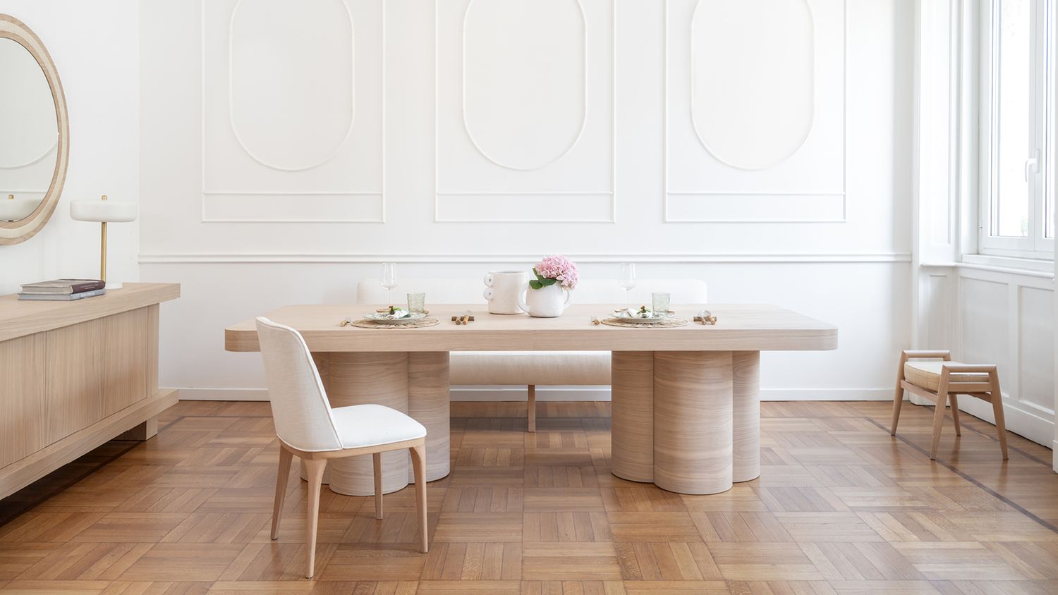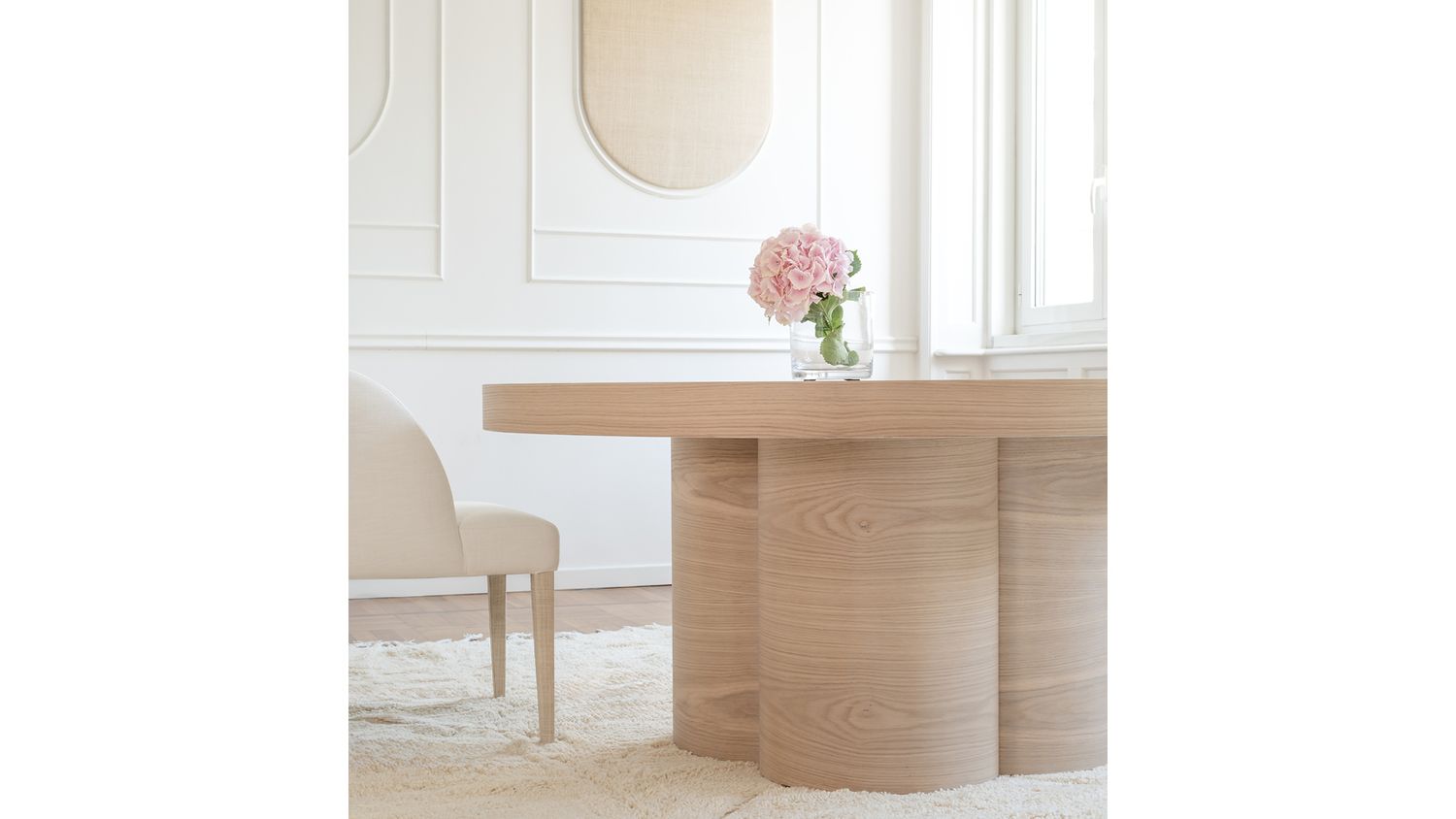 Il tavolo da pranzo della famiglia Belmont, rettangolare o rotondo, si distingue per il basamento in rovere, sostenuto da tronchi tagliati a quadrifoglio.