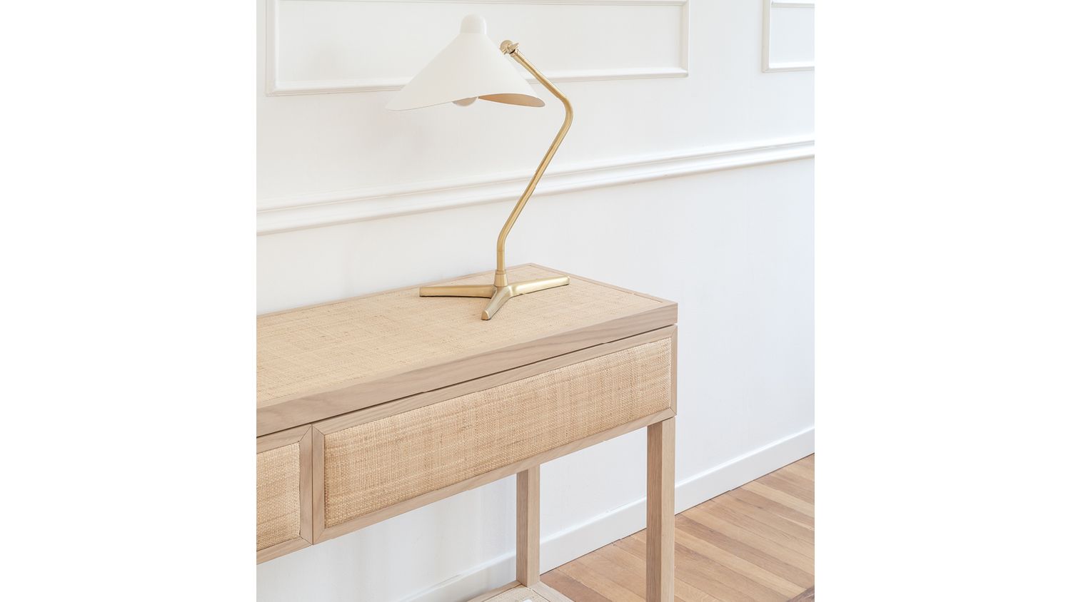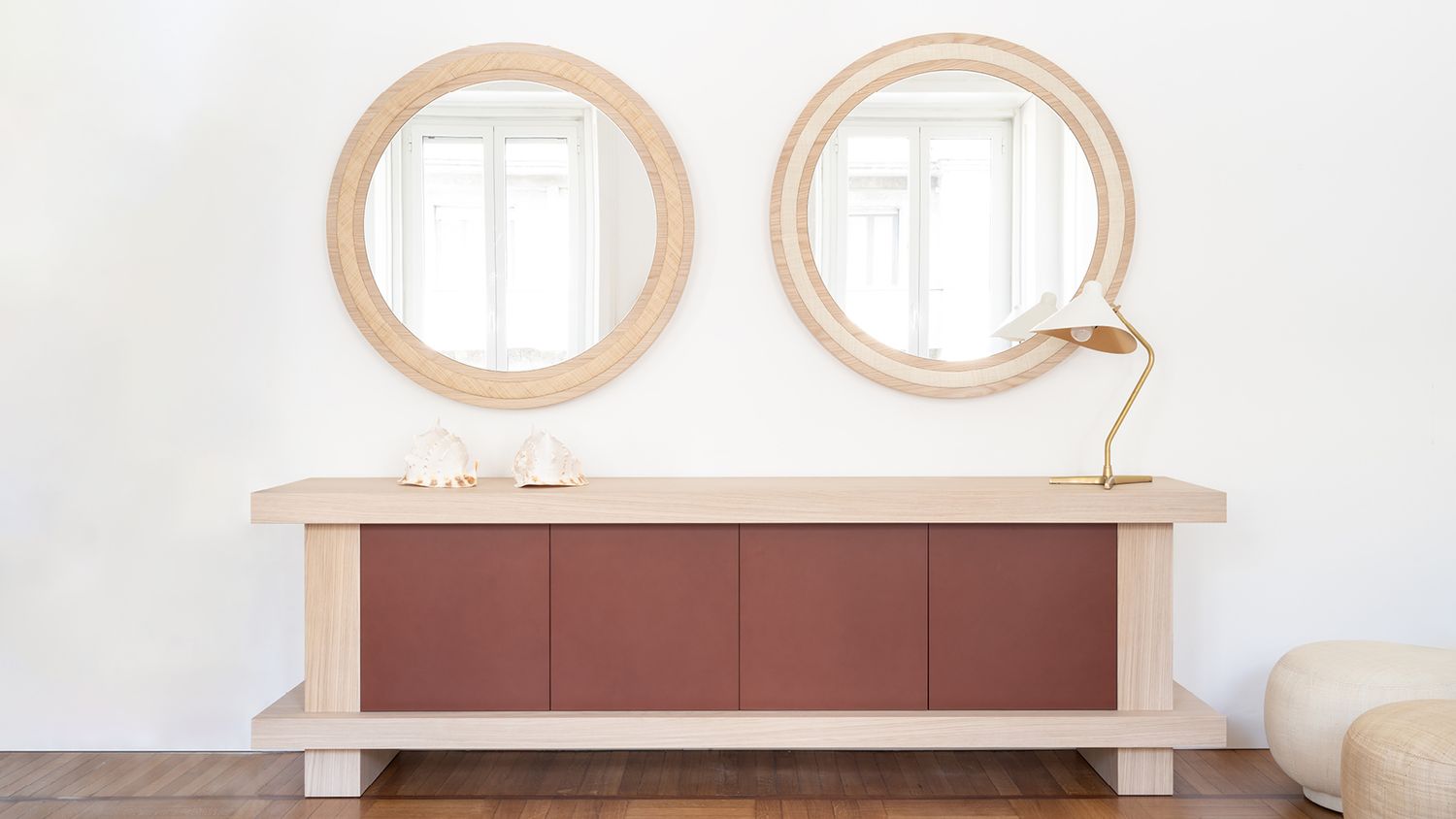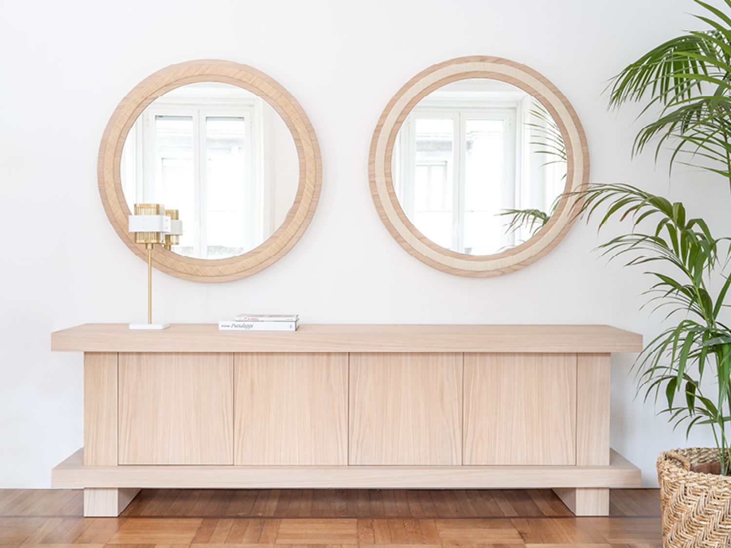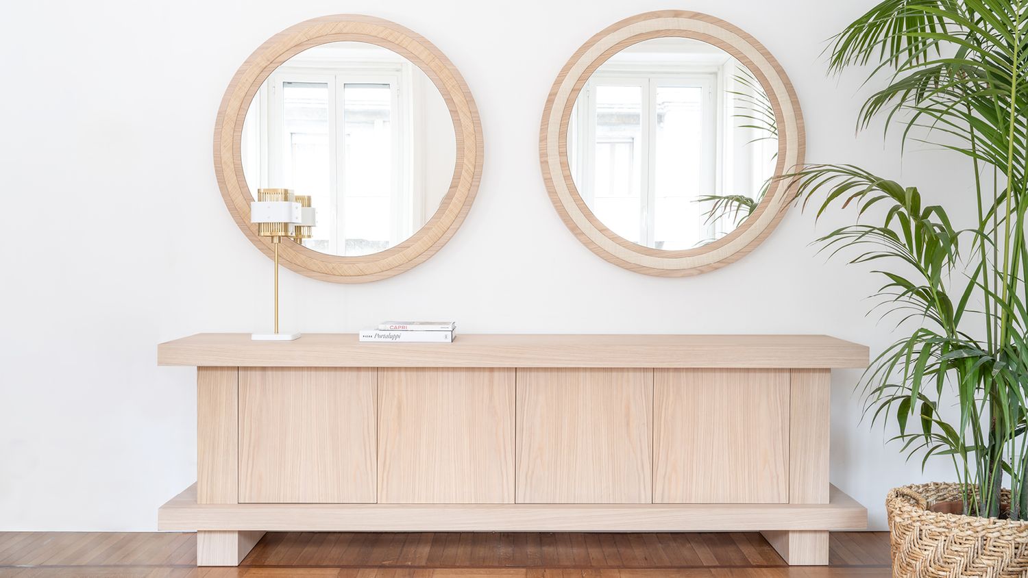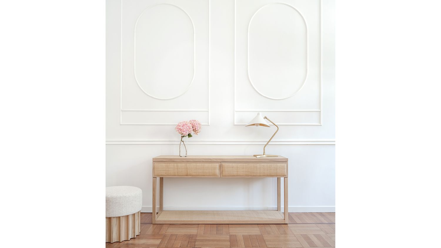 Tra le novità anche la console Martin che con la sua struttura leggera in rovere e il rivestimento in rafia incarna l’eleganza della semplicità.