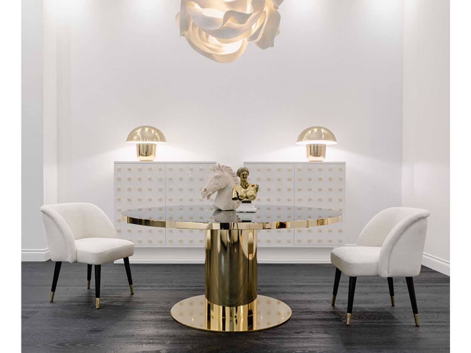 L’ottone lucido illumina la stanza, mentre il vetro del top gli conferisce un tono etereo.