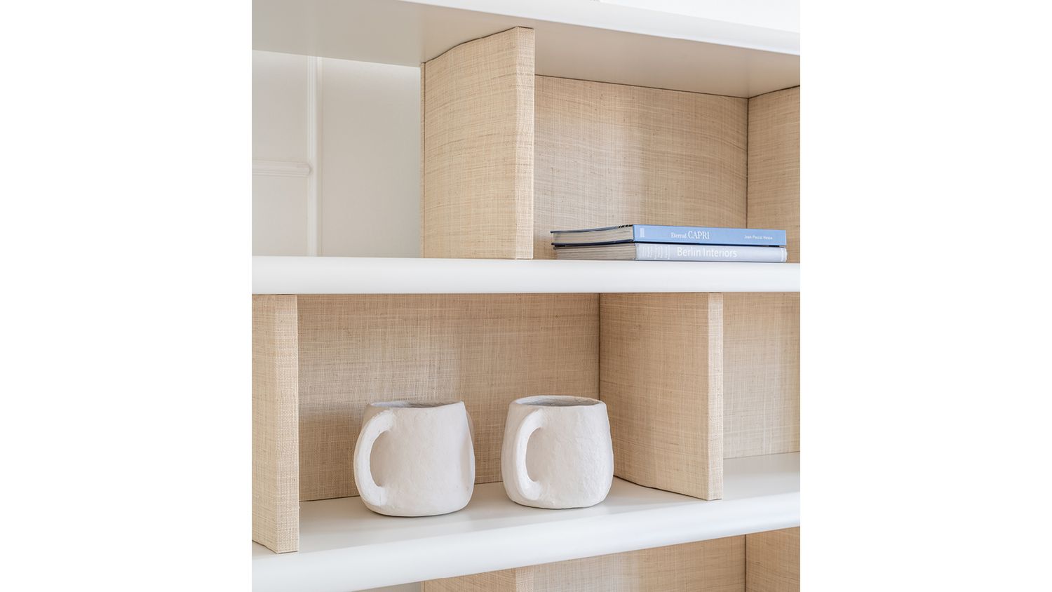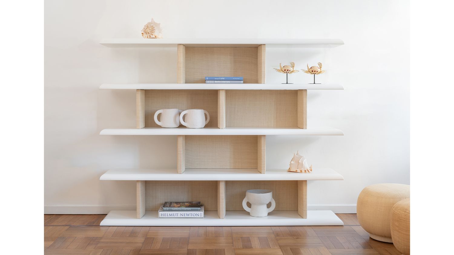 La famiglia di mobili Colorado si arricchisce di un nuovo elemento, la libreria, caratterizzata dalla finitura laccata dei ripiani che si sposa armoniosamente con i supporti e il retro rivestiti in rafia.