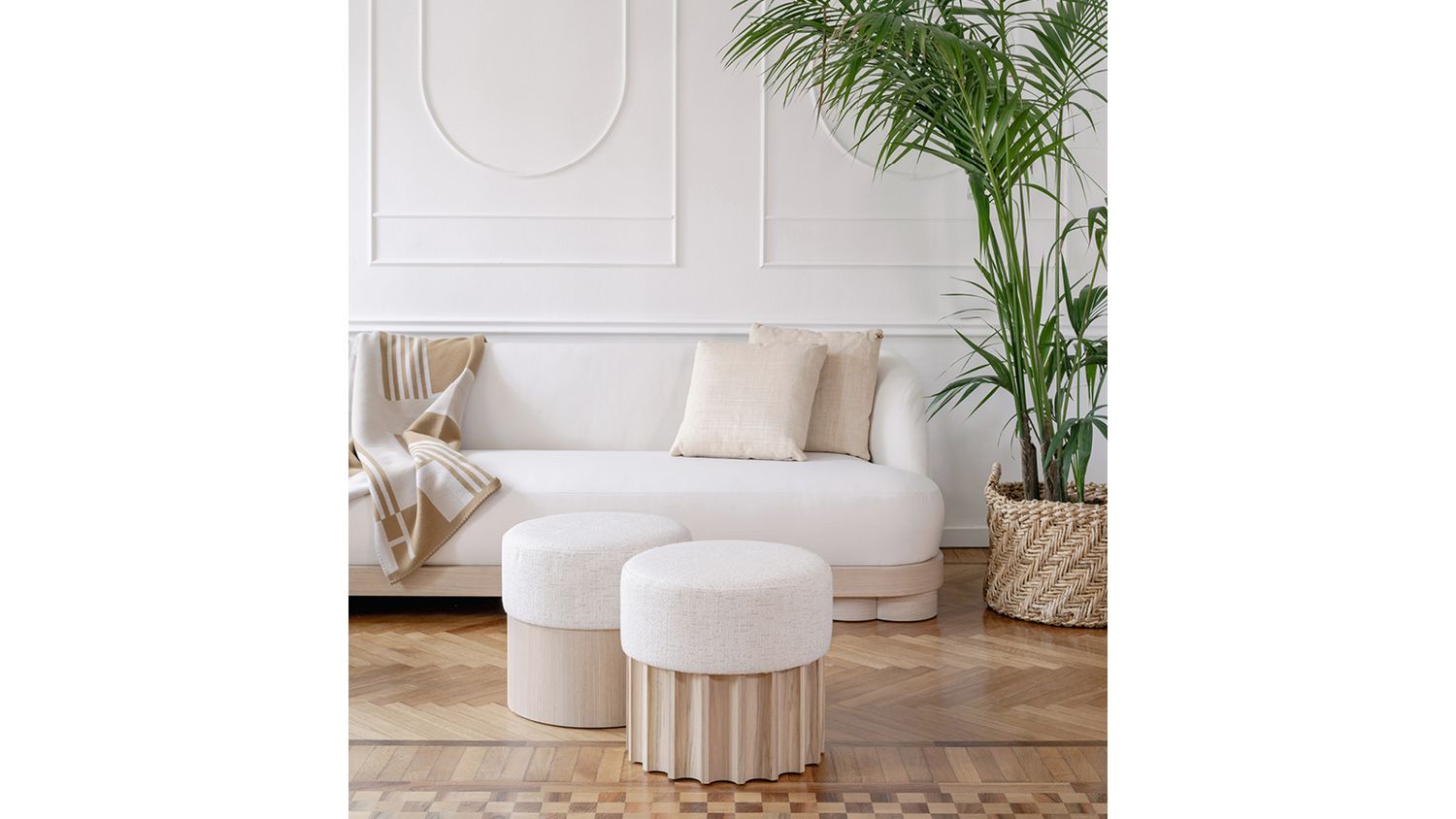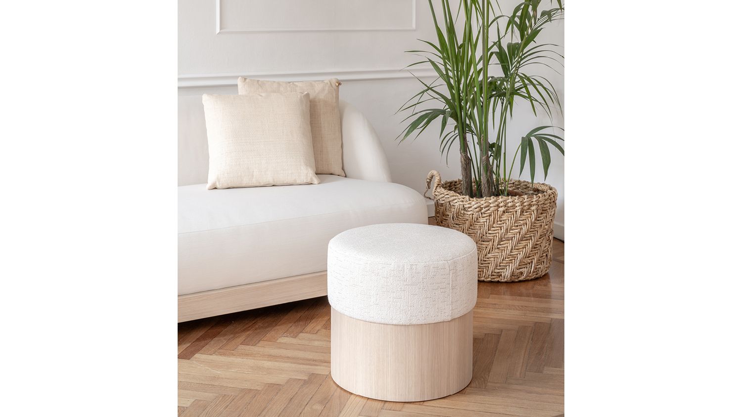 Versatili, cilindrici, Alassio e Spotorno sono i nuovi pouf con basamento in rovere e seduta in tessuto. Spotorno è caratterizzato da una base che ricorda una colonna ionica.