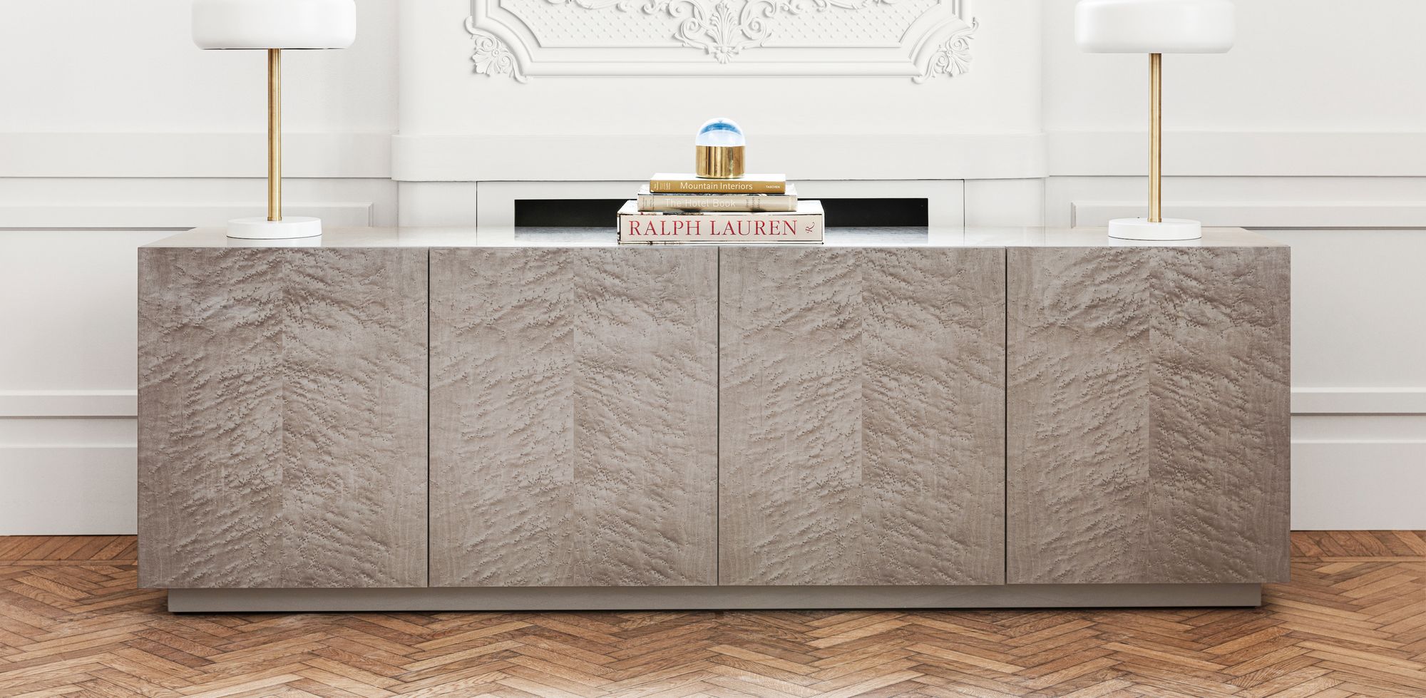 L’erable occhiolinato crea un disegno distintivo che ricorda piccoli occhi che emergono da linee morbide. La struttura si presenta con quattro ante che definiscono i due spazi interni, ognuno con un ripiano laccato.