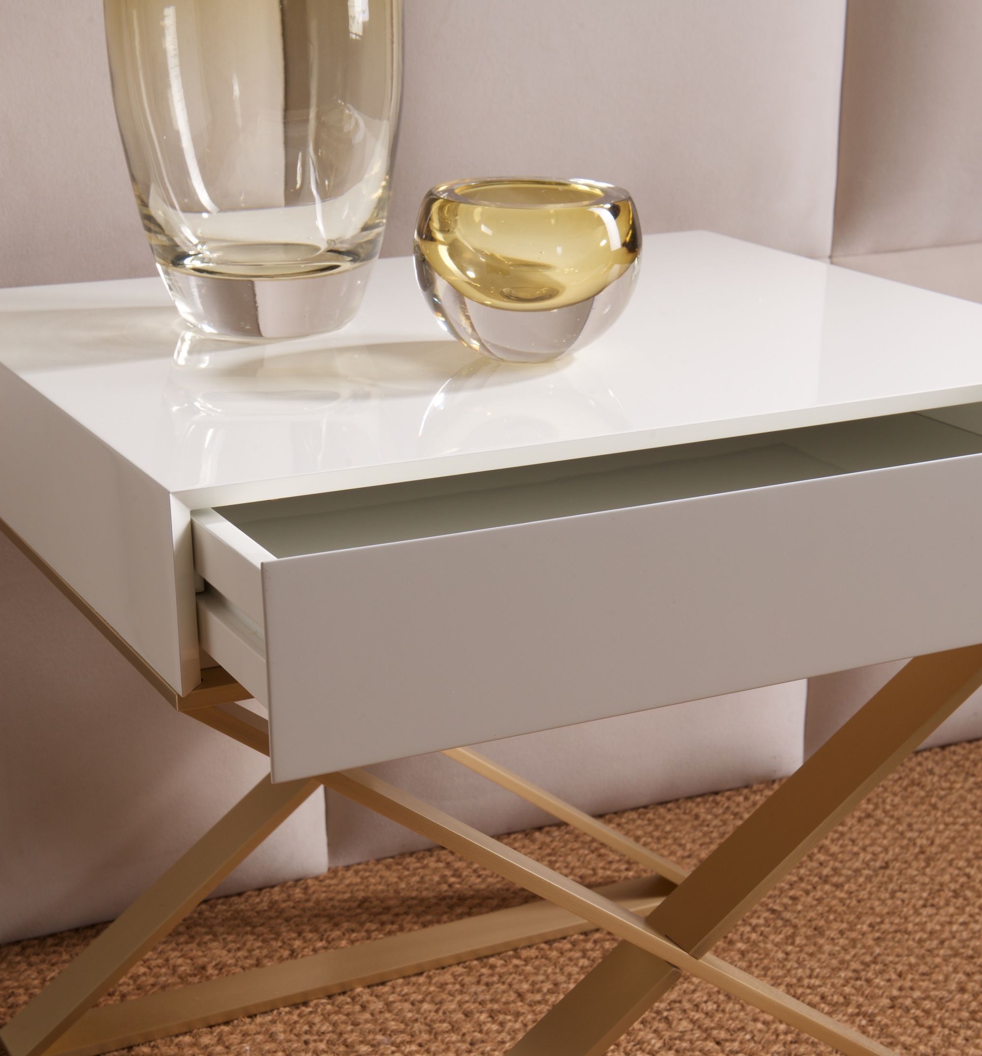 Top disponibile in laccato lucido e opaco. Base in metallo in bronzo o ottone satinato.