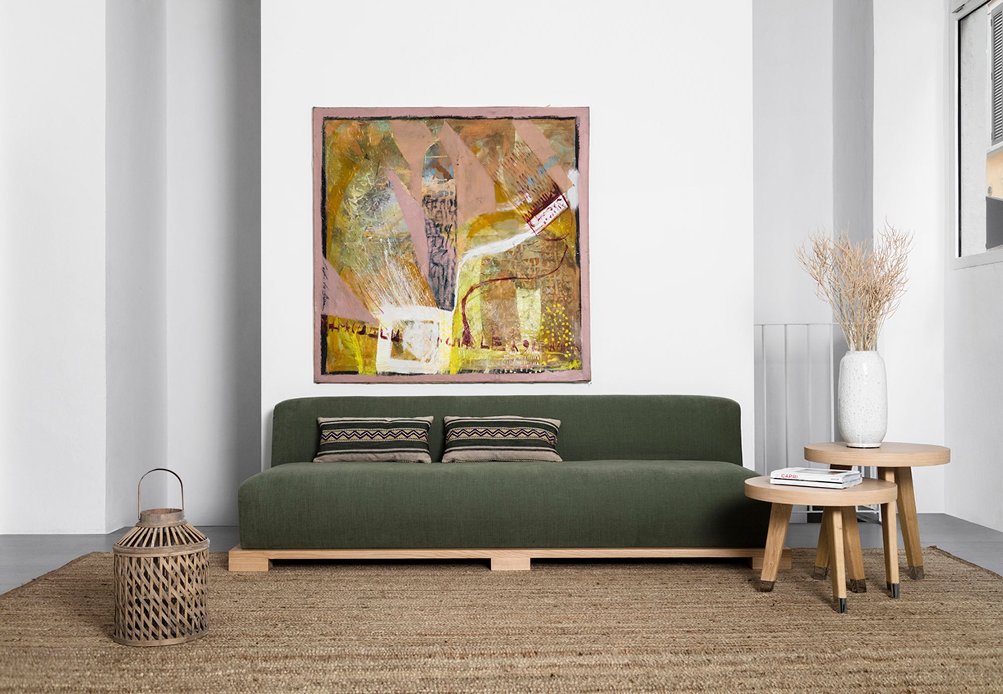 Bali nasce nel segno della sospensione e della natura. Come le palafitte dell’isola che gli dà il nome, unisce il senso di emersione da una superficie — la pedana sostiene un enorme cuscino, reso comodo da uno schienale, e i due compongono insieme una sorta di zattera — con i colori della natura e l’irregolarità di materie ricche di spontaneità.
