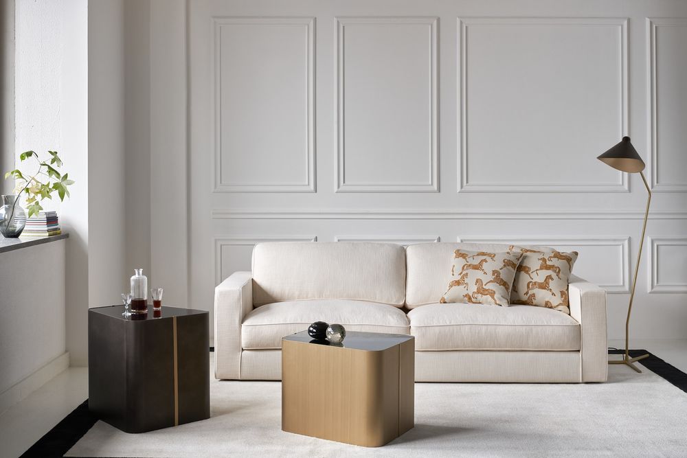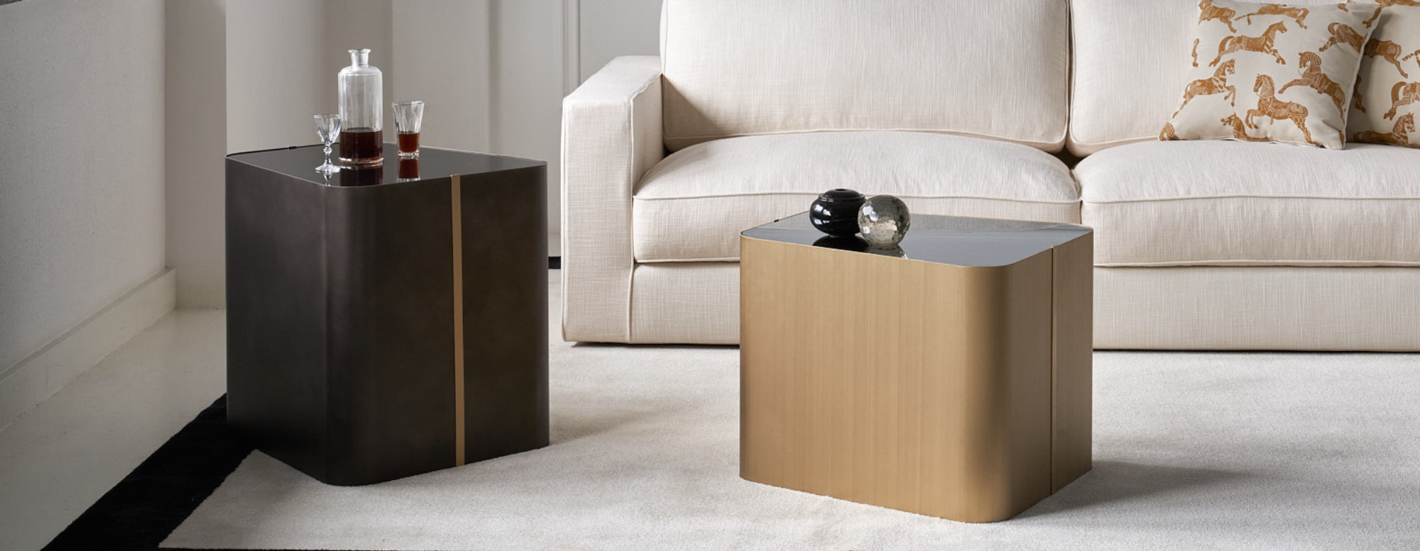 Tavolini da appoggio, da usare singoli o in coppia, le cui forme asimmetriche rimandano ad un gusto anni '60. La struttura si presenta in metallo laccato bianco o nero o con finitura in bronzo, ottone satinato e peltro. Il top è in vetro laccato nero/bianco o specchio.